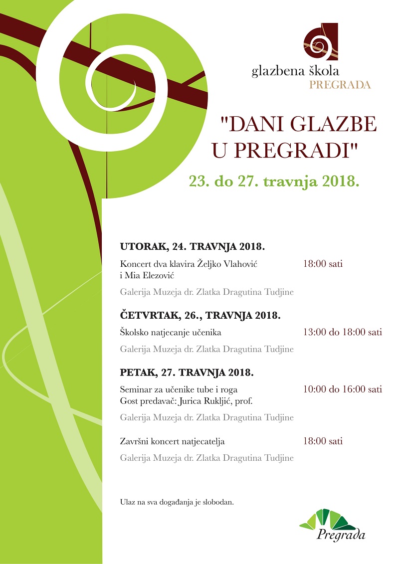 Glazbena škola Pregrada od 23. do 27. travnja organizira Dane glazbe u Pregradi. U ovom glazbenom tjednu svi posjetitelji imat će priliku uživati u izvedbama poznatih skladbi od strane učenika glazbene škole, profesora te gostiju izvođača. Događanja će se održavati u galeriji Muzeja dr. Zlatko Dragutin Tudjina, a započet će koncertom dva klavira u izvedbi Željka Vlahovića i Mie Elezović. Dio programa čini i seminar za učenike tube i roga, na kojemu će kao predavač sudjelovati profesor Jurica Rukljić.