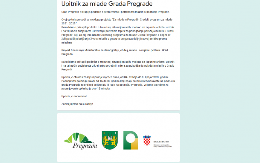 Anketa je anonimna i u istraživačke je svrhe, a rezultati će poslužiti u izradi novog programa za mlade grada Pregrade.