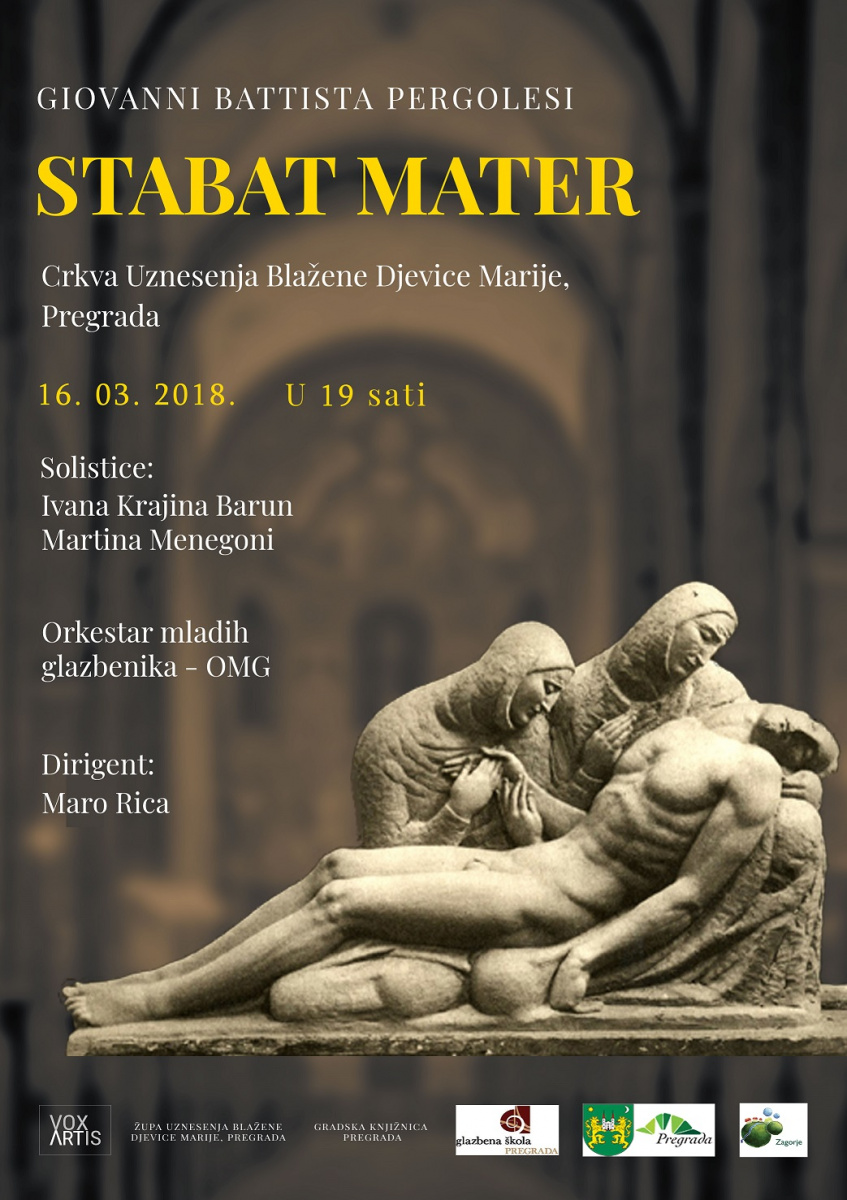 U Crkvi Uznesenja Blažene Djevice Marije u Pregradi sljedeći će se petak, 16. ožujka 2018. s početkom u 19 sati održati prigodni korizmeni koncert na kojem će Orkestar mladih glazbenika s Muzičke akademije u Zagrebu izvesti jedno od kapitalnih djela klasične glazbe „Stabat Mater“ Giovannija Battiste Pergolesija.