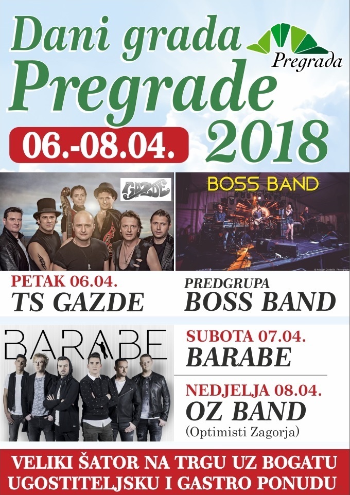 Na Trgu Gospe Kunagorske ponovno vas očekuje šator dobre zabave, koji će biti postavljen od 6. do 8. travnja. U petak je za dobru atmosferu pod šatorom zadužen tamburaški sastav Gazde, iz zagrebačkog Markuševca, a prije njih, publiku će zagrijavati Boss band, zabavni sastav već dobro poznat zagorskoj publici zbog nastupa u mjestima diljem županije.