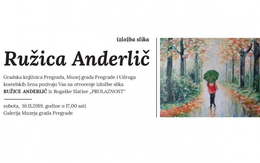 Gradska knjižnica Pregrada, Muzej grada Pregrade i Udruga kostelskih žena pozivaju vas na otvorenje izložbe slika Ružice Anderlič iz Rogaške Slatine pod nazivom „Prolaznost“.
