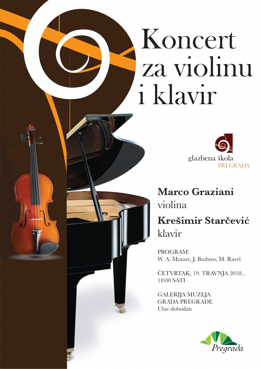 Glazbena škola Pregrada priređuje koncert Marca Grazianija na violini i Krešimira Starčevića na klaviru, koji će se održati u četvrtak 19. travnja s početkom u 18:00 sati u galeriji Muzeja dr. Zlatko Dragutin Tudjina.